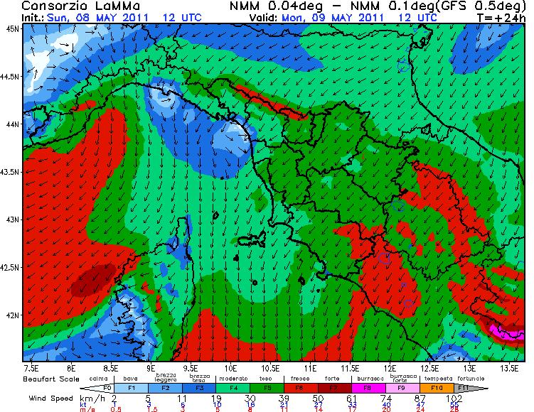 Lunedì 8 maggio: cielo sereno con addensamenti solo sui crinali appenninici. Vento moderato tra 20 e 30 km/h di tramontana (vedi foto) che ci terrà compagnia per tutta la giornata, in calo alla sera e nella notte. Temperature massime in calo non superiori ai 19/21 gradi, minime ancora molto fresche comprese tra 2 e 5 gradi nei fondovalle.
