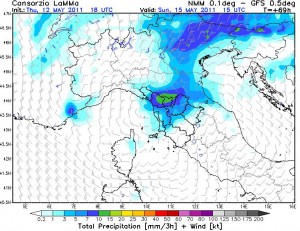 Domenica 15 maggio: molte nubi sin dal mattino con piogge in arrivo da metà mattinata. L’aria fredda, durante la notte precedente, avrà scavato un minimo di pressione sul golfo ligure che invierà nuclei temporaleschi un po’ per tutta la giornata con fenomeni localmente abbondanti ed intensi, sopratutto tra tarda mattinata ed il pomeriggio. Prestare la massima attenzione.