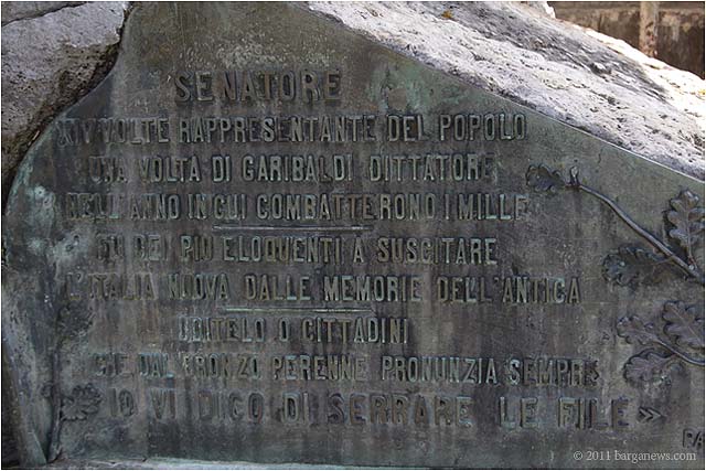 Sempre di Pascoli è la bella epigrafe alla base del monumento e che recita: “Senatore, XIV volte rappresentante del popolo, una volta di Garibaldi dittatore, nell’anno in cui combatterono i Mille, fu dei più eloquenti a suscitare l’Italia nuova dalle memorie dell’antica, uditelo o cittadini, che dal bronzo perenne pronunzia sempre “io vi dico di serrare le file””.