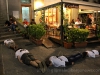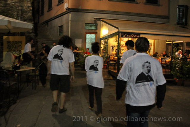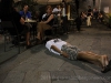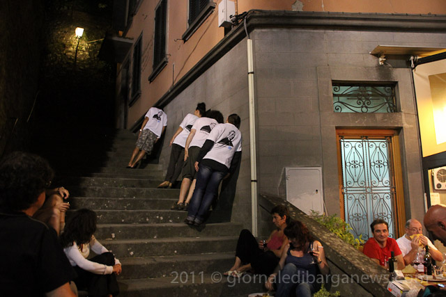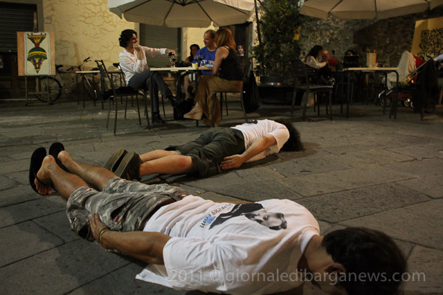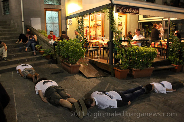 There might have been some high culture taking place in Barga this week with the sounds of Vivaldi seeping out of open windows in the castle as Opera Barga prepares the Operabarga festival later on this week but in Piazza Angelio this evening it was culture of the lowest form possible as a group of performance artists put on a brief show for the people eating at the L’osteria, most of whom seemed to have had problems understanding just what was happening in front of them as the first ever mass planking session was created in this area.