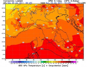 Prepariamoci a soffrire. Il caldo ha iniziato a farsi sentire già dalla giornata di ieri, proseguirà oggi e, da domenica, si accentuerà(nella foto le temperature previste a circa 1500 metri, possiamo vedere la +18 che abbraccia le nostre zone e che corrisponde ad un +33/+34 gradi al suolo). Un contributo determinante alla sensazione di fastidio dei prossimi giorni deriverà dall’elevato tasso di umidità presente nell’aria che si farà sentire sopratutto tra la notte ed il primo mattino.