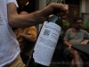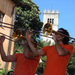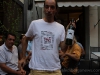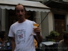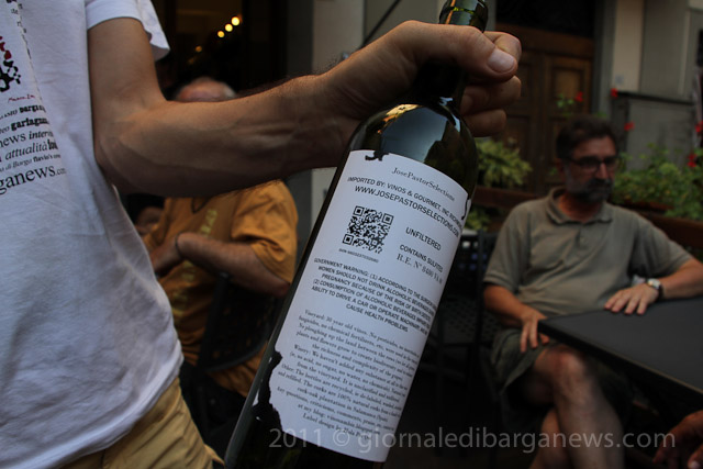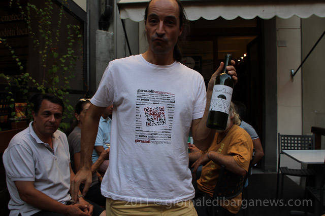 Fabio Bartolomei in Piazza Angelio this afternoon holding up a bottle of his organic white wine grown and bottled in Spain and presented for the first time here in Barga at an informal wine tasting session at the enoteca Colordivino.
