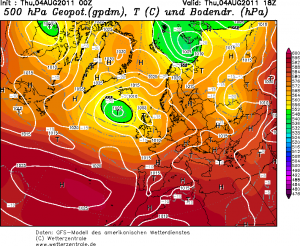 Un promontorio di alta pressione ha preso possesso della nostra Penisola determinando un miglioramento delle condizioni meteo associato ad un aumento delle temperature sino a valori pressoché in media con il periodo. Contemporaneamente una profonda depressione, alimentata da aria artica, agisce ad ovest dell’Irlanda inviando fronti nuvolosi a ripetizione sull’Europa centrale che interessano anche le nostre regioni alpine (nella foto la distrubuzione della pressione, il rosso e la lettera “h” indicano alta pressione., i colori giallo e verde e la lettera “t” pressione piu bassa).
