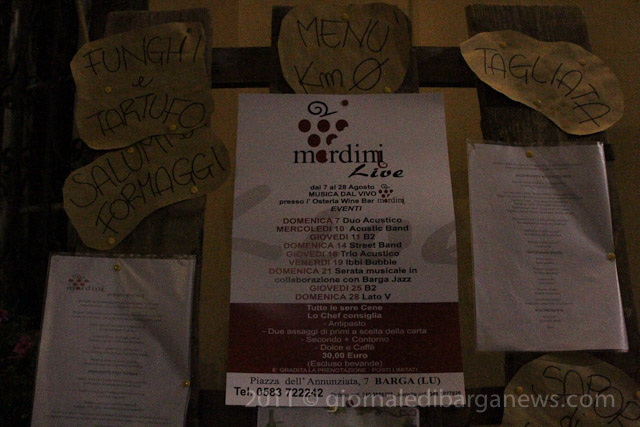 As we reported earlier on this summer (article here) – “the Mordimi osteria in Piazza Annunziata in Barga Vecchia re -opened their doors recently with the sound of music playing in the background as new management and a new direction brings once again this corner of Barga to life.” … and they have certainly lived up to that expectation with a full “musical menu” playing for most of last month.