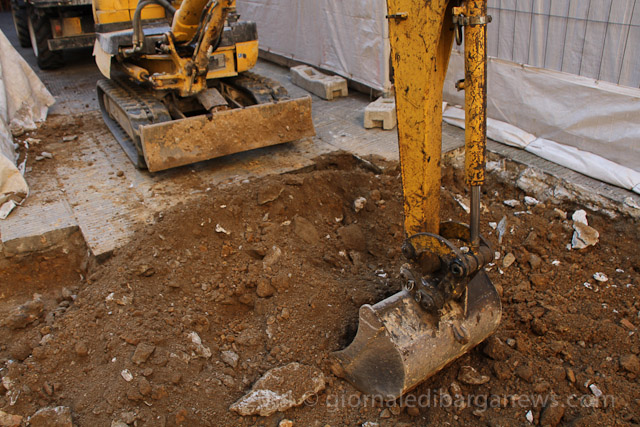 Ritrovamento insolito ieri mattina nel cantiere dei lavori che stanno interessando Piazza Salvo Salvi, sotto il Comune di Barga. Sulla piazza è in corso la rimozione delle pietre di pavimentazione per individuare le infiltrazioni d’acqua che si registrano nei sottostanti locali della volta dei Menchi dove presto sarà realizzato il museo delle rocche e delle fortificazioni della Valle del Serchio.
