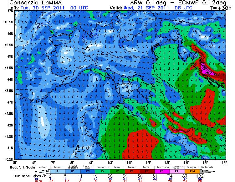 Il sole è tornato a splendere anche se le temperature si sono decisamente abbassate ricordandoci che siamo ormai in vista dell’autunno. Il vento moderato-forte di Tramonana che sta soffiando nella giornata odierna tenderà, gradualmente, ad attenuarsi sino a debole nella serata di domani (vedi foto).