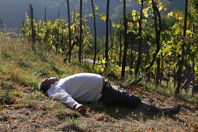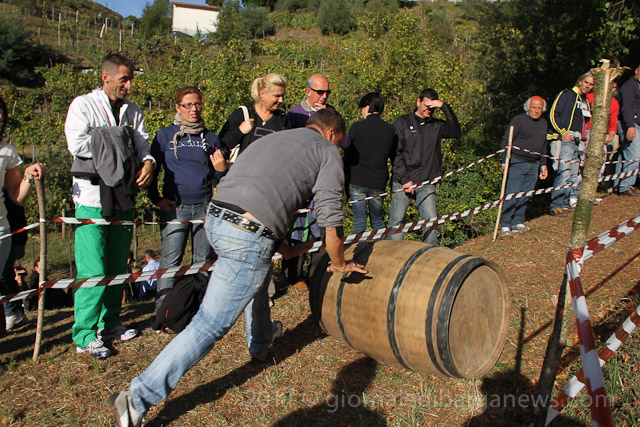 Further up from the village, maybe a clue as to why the village fountain was spouting wine – it would seem that it was the only place where wine could be kept as all the wine barrels were being used to something else – a fiercely contested barrel race on the steep side of a mountain in amongst the vineyards.