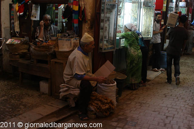 Ore 15,30. La medina (Fès el-Bali) è come sempre un tuffo nel 1300 con lo stesso stile di vita e lo stesso brulichio di gente, lo stesso tornado di colori e di odori, le stesse emozioni forti e che riportano indietro nei secoli. Qui il tempo non passa mai.