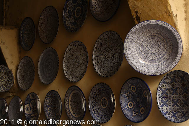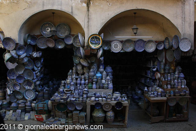 Questo è solo un piccolo assaggio di tutto quello che vedrete e troverete nei negozi di Fès dove comunque tra le “specialità”, oltre agli articoli in pelle, è un trionfo di ceramica con i classici disegni di colore blu. Buoni affari si fanno in proposito al cosiddetto souq dell’Hennè, dove ora si vendono solo ceramiche. A proposito di merce in vendita… ovunque vi chiederanno di acquistare hashish, in Marocco Kif, che viene prodotto a poca distanza da Fès nei monti del Rif. Nonostante sia vietato usare e spacciare sostanze stupefacenti, non è raro vedere qualcuno per le vie della vecchia Medina fumare Kif con la classica pipa in legno alla quale si collega un fornellino in terracotta.