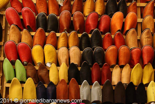 Quella che ammirerete dalle terrazze dei negozi è la più vecchia conceria di Fès e risale al 1200. I metodi di lavorazione non sono pressoché cambiati: le pelli arrivano a dorso d’asino (praticamente una versione animata dell’Ape con il quale si trasporta di tutto) e nelle grosse vasche circolari rivestite di ceramica bianca prima si tratta il pellame con prodotti tipo calce, urina di vacca (per il potassio) e escrementi di piccione, uniti alla cenere. Molto più delicati i colori ricavati dall’indaco, lo zafferano e il papavero.