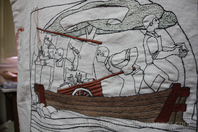 The Scottish Diaspora Tapestry – a completely new work depicting the events of the Scottish diaspora. Barga with its long history of movement between the city and Scotland has been given the chance to contribute to this exciting project with a series of embroidered panels in the tapestry. The main design will be done by the Scottish artist Andrew Crummy who will print his finished image onto the linen panels and which along with the needles, wool and thread will then sent to the volunteers so that they can start work stitching the final panels.