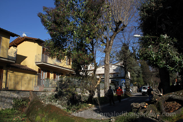 “Nei giorni di Natale un ramo si era già staccato da una di queste piante cadendo nel mio giardino – ci dice un altro abitante – oggi è caduta una pianta intera. Che cosa si aspetta ancora a tagliare le piante malate?”