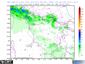 Domani mattina, giovedi, ci sveglieremo con cielo già nuvoloso e con il passare delle ore inizieranno anche le precipitazioni, deboli a tratti moderate e più insistenti a ridosso dell’Appennino (nella foto le piogge previste tra mattina e tardo pomeriggio di giovedi). La quota neve si alzerà stante i valori di temperatura previsti anche alle quote medie, un’alta occasione persa per i nostri monti in una stagione che si farà ricordare per l’assoluta scarsità di neve…