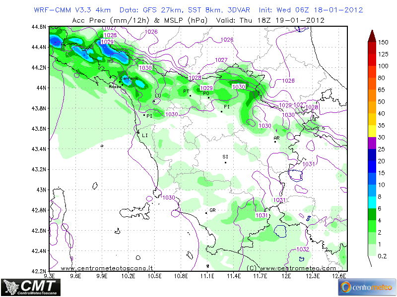 Domani mattina, giovedi, ci sveglieremo con cielo già nuvoloso e con il passare delle ore inizieranno anche le precipitazioni, deboli a tratti moderate e più insistenti a ridosso dell’Appennino (nella foto le piogge previste tra mattina e tardo pomeriggio di giovedi). La quota neve si alzerà stante i valori di temperatura previsti anche alle quote medie, un’alta occasione persa per i nostri monti in una stagione che si farà ricordare per l’assoluta scarsità di neve…