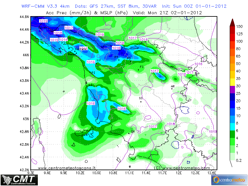 Lunedi 2 gennaio 2012: cielo molto nuvoloso sin dal mattino con deboli precipitazioni in intensificazione con il passare delle ore fino a forti e molto forti tra pomeriggio e serata. Nella notte tendenza a miglioramento con attivazione di correnti di tramontana. Quota neve molto elevata, oltre i 1800 metri al mattino in calo nella serano sino ai 1200.