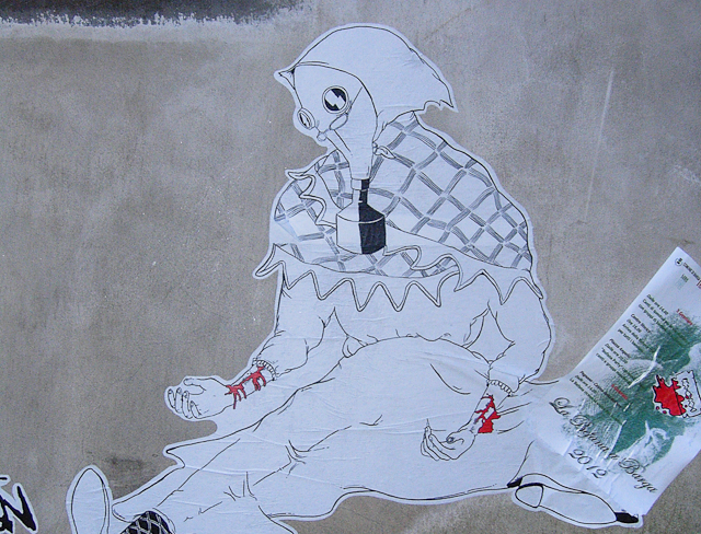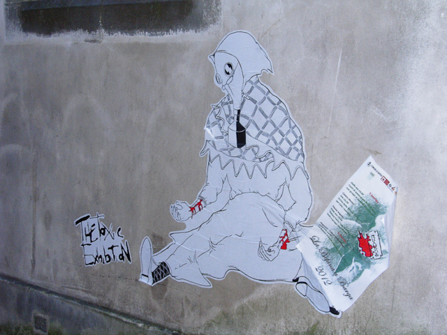 Come si vede dalle foto, è raffigurata, con lo stesso stile degli altri disegni già apparsi, una Befana atipica che, accompagnata dalla scritta “The toxic exhibition” e da un manifesto degli eventi della Befana 2012 a Barga, si è tagliata le vene.