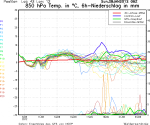 Nella foto vediamo il grafico “spaghetti” che racchiude le varie emissioni modellistiche e possiamo notare come dal 17 gennaio in avanti i vari cluster tendano a diminuire con un contestuale aumento della probabilità di precipitazioni.