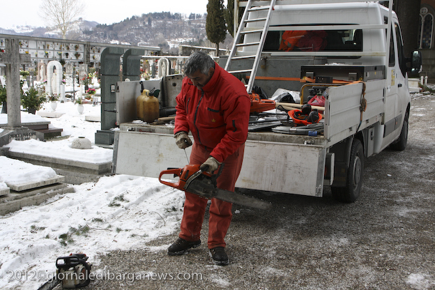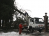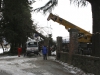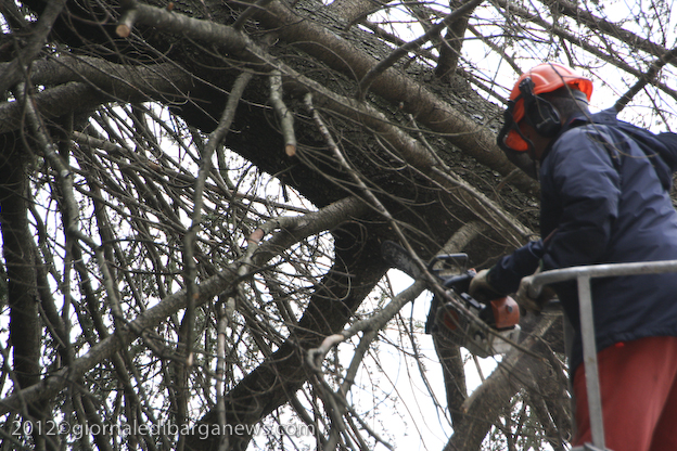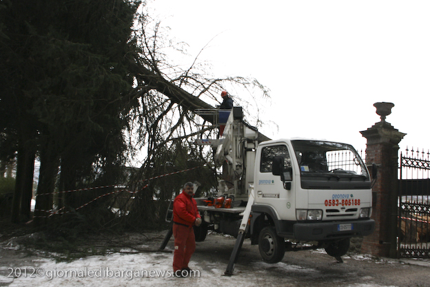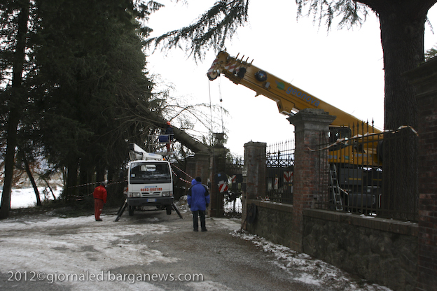 Dal primo pomeriggio sono a lavoro sul posto gli operai di Terra Uomini Ambiente e di Geonova, dato che è stato necessario far intervenire una gru che sollevasse l’albero per non far incidere il suo peso sulla recinzione mentre veniva sfrondato e capitozzato per renderlo più gestibile. Infine sarà fatto a pezzi e rimosso.