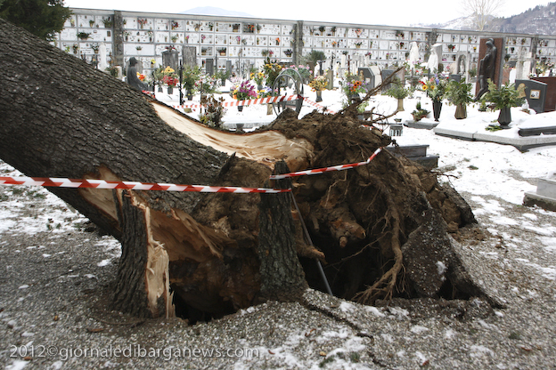 Nella tarda mattinata di sabato uno dei cedri del cimitero di Sigliari, a San Pietro in Campo, non ha retto ed è stato praticamente sradicato anche se era sano e saldo. Fortuna ha voluto che fosse uno dei più vicini alla recinzione, così che è caduto all’esterno, adagiandosi su un gruppetto di altri alberi fuori dal perimetro del camposanto.
