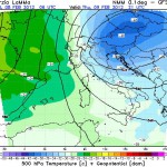 Giovedi 9 febbraio ore 8: si conferma l’impianto generale con il nucelo gelido in discesa da nord est che impatterà in serata contro l’arco Alpino. Dal tardo pomeriggio inizierà a formarsi una blanda depressione ed est della Corsica che tenderà ad approfondirsi con il passare delle ore. Nella foto vediamo la situazione barica nella prossima notte con il nucleo gelido con valori di -40 gradi a circa 5.000 metri in prossimità dell’arco alpino orientale. Dopo aver registrato una temperatura minima di -6,9 gradi, ci attendiamo una giornata sostanzialmente tranquilla con qualche nube passeggera e molto sole. Durante la notte assisteremo ad un veloce peggioramento delle condizioni meteo con vento forte di grecale associato a possibili rovesci di neve ventata in miglioramento nella mattina di venerdi. Questa previsione è comunque da confermare tenendo conto dell’effettivo impatto del nucleo freddo contro le Alpi e della quantità di aria fredda in entrata dal Rodano. Prossimo aggiornamento ore 18 circa, prima in caso di importanti novità.