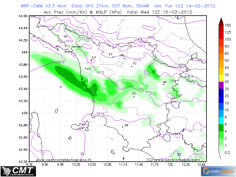 Se non interverranno cambiamenti avremo, quindi, un aumento delle nubi durante la notte, la mattina di domani si aprirà con cielo molto nuvoloso e possibili deboli precipitazioni nevose già in corso durante la notte e possibili fino al primo pomeriggio prima di un miglioramento deciso e, per quanto concerne il freddo, definitivo. Nella foto, tratta dal WRF del Centrometeotoscana, possiamo apprezzare le precipitazioni previste entro le ore 12 della giornata di domani, più interessato il livornese ed il pisano ma precipitazioni sono previste anche sulla nostra valle.