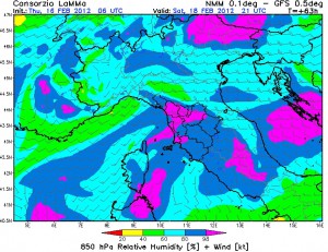 A causa dell’orientarsi da sud ovest delle correnti, sopratutto alle quote medie (vedi foto), la nuvolosità tenderà ad aumentare già nelle prime ore della giornata di sabato e, con il passare delle ore ci attendiamo qualche debole precipitazione, in intensificazione nella notte su domenica.