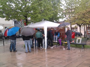 Giovedì e venerdì il presidio attivato a Barga è stato spostato anche a Fornaci in piazza IV Novembre dove le maestranze dello scatolificio Corsonna, sotto una pioggia battente, sono state comunque sempre presenti ed hanno distribuito volantini e parlato con la gente. Molti si sono fermati ad ascoltare la loro storia in questi giorni ed in tanti hanno espresso la propria solidarietà. Tra questi anche i lavoratori della Smurfit Kappa Ania di Ponte all’Ania e della KME di Fornaci. Dai due stabilimenti sono giunti degli striscioni con i quali gli operai hanno preso parte al presidio in m odo simbolico.