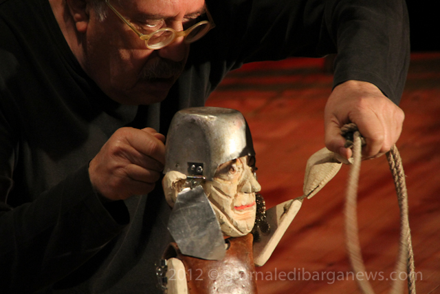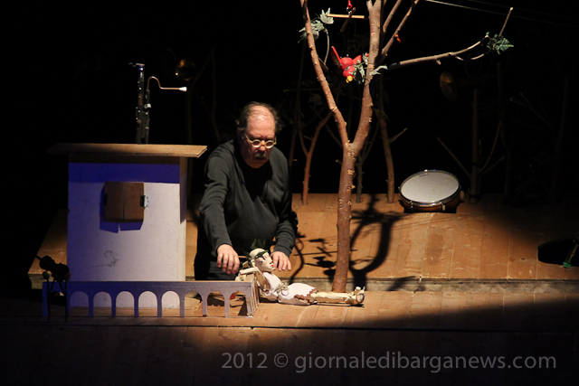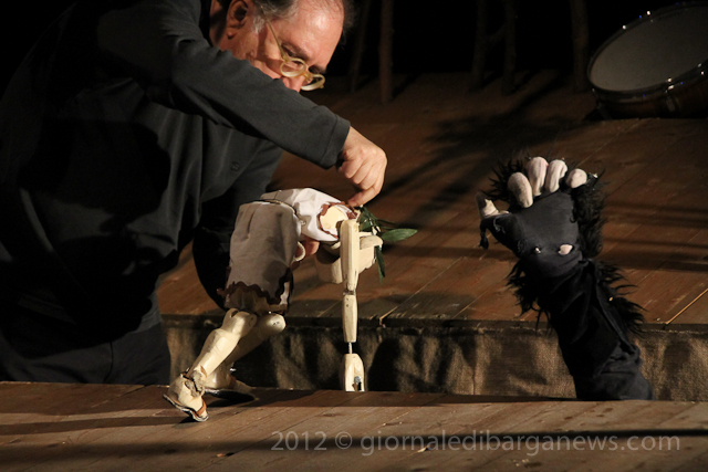 So, it comes as a pleasant surprise to find that this morning the Teatro dei Differenti was filed with children from infant schools in the area completely immersed and enjoying a form of entertainment that moves at a far slower pace and direction than they would normally be used to – The Unotheatre with Doctor Bostik – Dino Arru with Raffaele Arru and the Dottor Bostik puppets presenting “Ho visto il lupo – I’ve seen the wolf ” loosely based on Prokofiev’s Peter and the Wolf with large, sculpted wooden puppets taking centre stage.