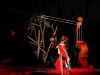 The scene opens, the audience sees a large wooden slope and hear Prokofiev’s march in B minor, Opus 99. Each piece of scenery is carefully placed on stage to the rhythm of the music. A wood emerges, the house of Peter and his grandfather is built in front of our eyes, a large tree and some flowers take root, the edges of a pond appear. The spectacle takes the form of a large metaphysical painting in which all the instruments from Prokofiev’s Peter and the Wolf have their place. And thus, accompanied by the music, the puppeteer brings the characters (large, sculpted wooden puppets) on stage.
