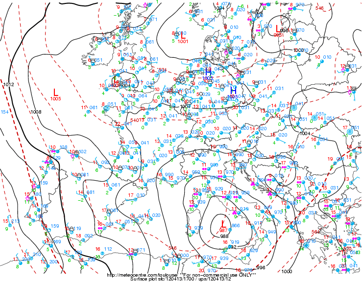 E’ stata ribattezzata Lucia l’intensa depressione mediterranea che sta apportando maltempo su Campania e Calabria oltre a determinare il tempo su metà Europa meridionale. Nella foto possiamo vedere la posizione di Lucia intorno alle ore 19.30 del 13 aprile con il centro depressionario in pieno mar Tirreno meridionale.