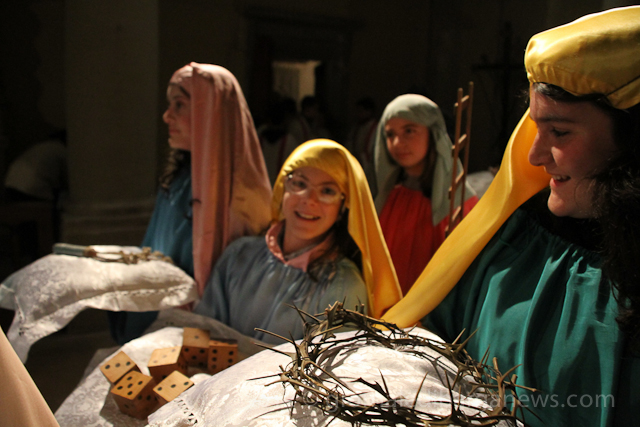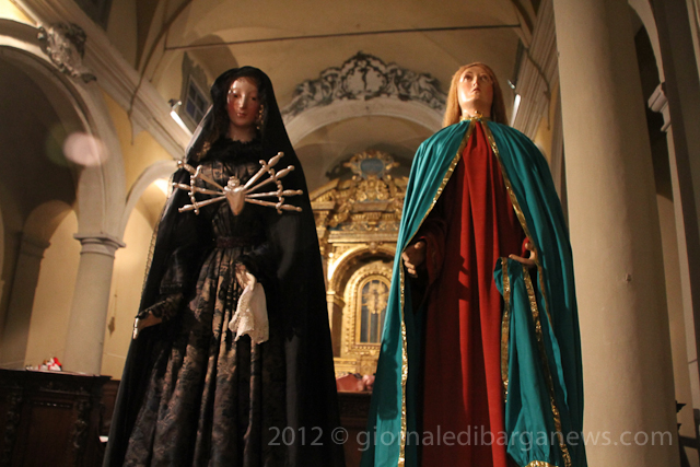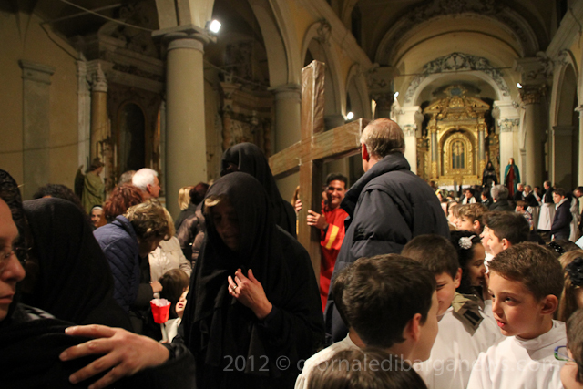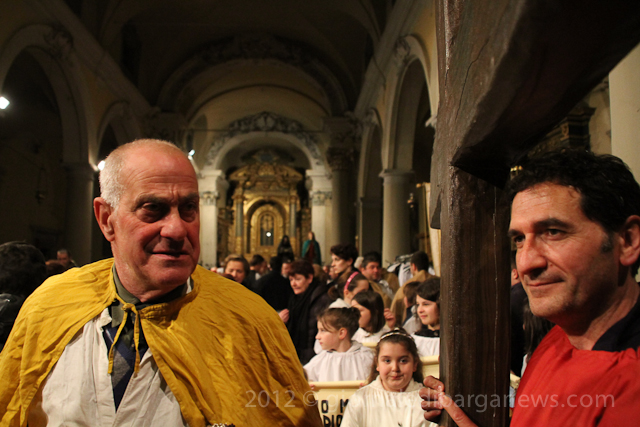 Utter chaos inside the church as hundreds of people are changing into costumes ready for the Processione di Gesù Morto which will thread its way through the narrow streets of Barga as it has done for generations.