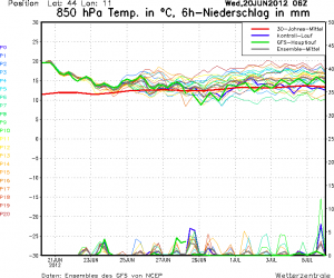 Come si nota dal grafico nella foto tutte le varie emissioni modellistiche vedono una generale tendenza alla diminuzione delle temperature fino a raggiungere la linea rossa, ovvero la media stagionale. Parallelamente ecco muoversi anche i “fili” relativi alle precipitazioni, sinonimo, in questo caso, di instabilità pomeridiana.
