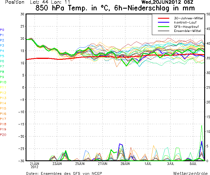 Come si nota dal grafico nella foto tutte le varie emissioni modellistiche vedono una generale tendenza alla diminuzione delle temperature fino a raggiungere la linea rossa, ovvero la media stagionale. Parallelamente ecco muoversi anche i “fili” relativi alle precipitazioni, sinonimo, in questo caso, di instabilità pomeridiana.