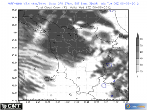 Mercoledi 6 giugno: giornata tra schiarite ed annuvolamenti, anche intensi ma senza precipitazioni (vedi foto tratta dal Lam del Centrometeo Toscana). Temperature invariate.