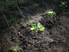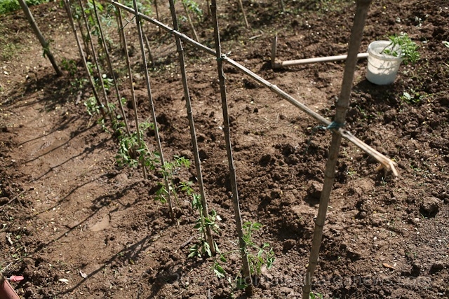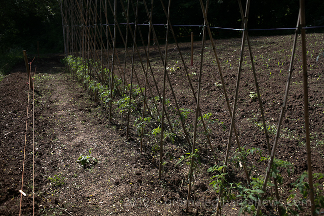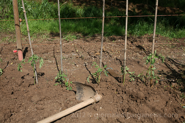 We lost no time at all in transferring them directly down to the field where we set up another row alongside the other 50 tomato plants already well-established and growing.