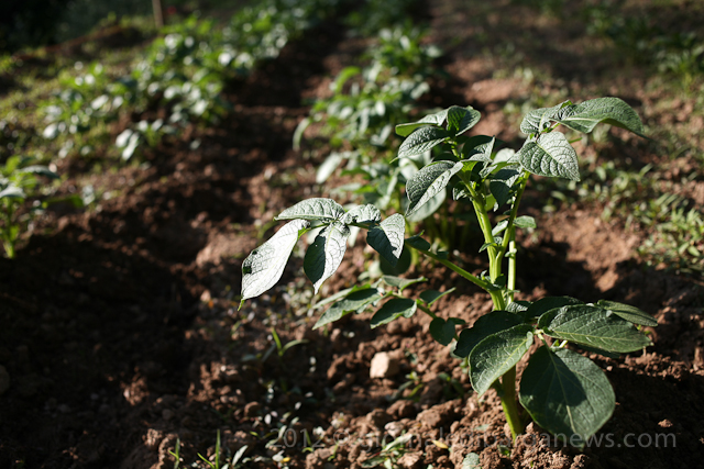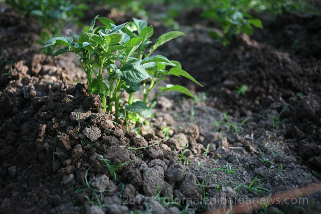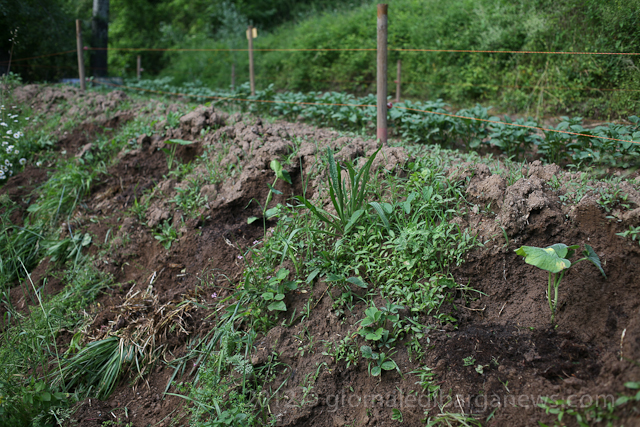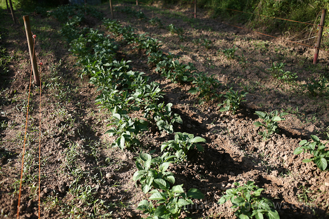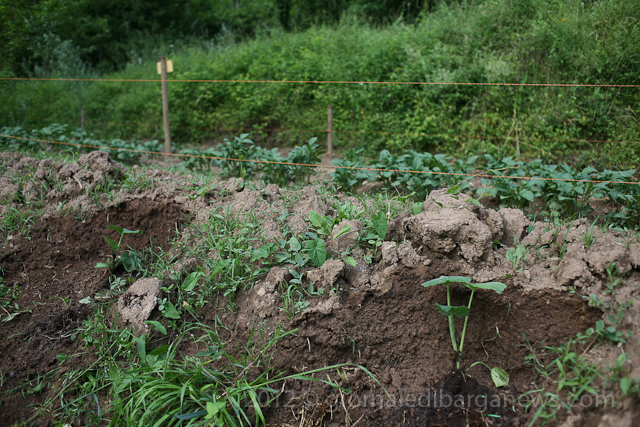 Even though there is still a ridiculous amount of water sitting along the edge of the top field, this evening some of the plants in the bottom field were starting to wilt from lack of water and so it was necessary to get the hose out and to irrigate the parched looking seedlings.