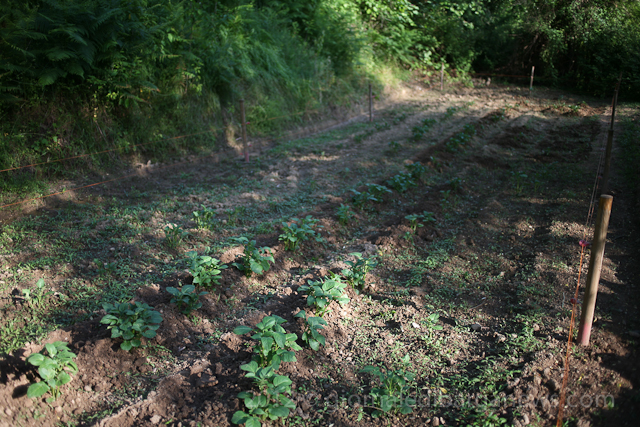 On the bank dividing the top and the bottom field, a little experiment – two varieties of pumpkins were planted in an attempt to maximise the amount of sun that they could soak up during the summer. Not sure if they will actually survive on a steep slope, we shall see.