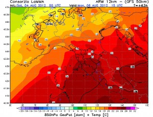 Da sabato 4 a martedi 7 agosto: tempo bello e soleggiato con nubi di passaggio nella giornata di lunedi ma senza conseguenze particolari. Ancora molto caldo con il picco di calore (vedi foto) nel pomeriggio di lunedì quando arriveremo a 36-37 gradi con elevata umidità. Afa.