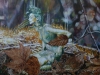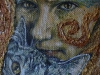 I cinque elementi della cultura occidentale, più il legno ed il metallo, presenti nella sfera mistica orientale, sono rappresentati nella loro più intima essenza spirituale.I colori e le forme rispettano, nei limiti della mia personale estetica,ma compenetrati armonicamente in essa, la complessa simbologia alchemica e filosofico-poetica delle due culture, occidentale ed orientale qui accostate su un comune sentiero di ricerca mistica. Agli elementi, graficamente rappresentati in maniera espressionista, da me preferita,sono accostate immagini di svariate specie di gatti, ritratti a trompe l’oeil (iperrealistici), che creano l’illusione di gatti reali entrati fisicamente nel quadro, in virtù della loro capacità di viaggiare tra le varie sfere dell’esistenza.L’ambiente stesso del dipinto si fa allora senziente della loro presenza e fra i gatti ed i daimon delle superfici dipinte si viene a creare un rapporto di reciproca interazione fisica e di intimo discorso intelletuale.”