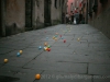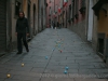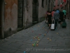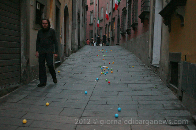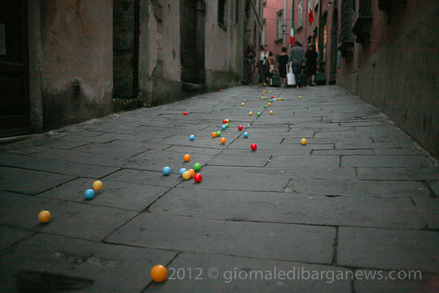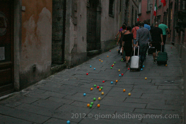 And if that wasn’t enough, as they left the city they symbolically left behind them hundreds of small coloured plastic balls which flowed out from the suitcases and down through the narrow street outside Casa Cordati.