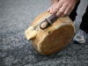Cheese throwers wrap a long strap around the cheese and attach the free end of the strap to their wrist. There’s a run-up and a jump, launching the cheese and using the leather strap as it unwinds to ‘whip’ it and give it maximum momentum.