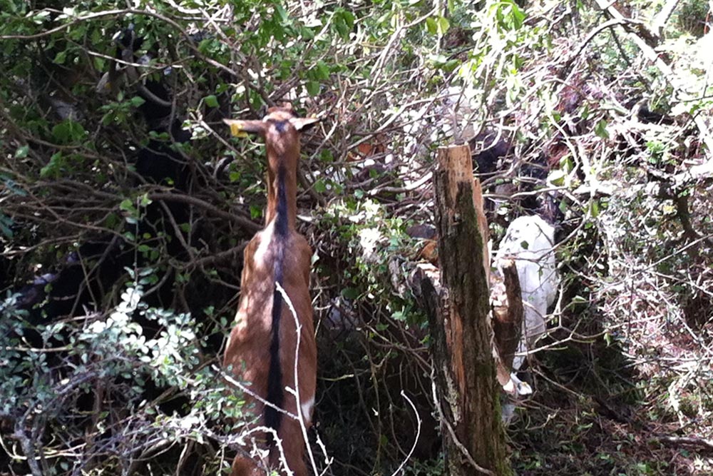 To their obvious delight, they found this morning a number of fresh leaves and shoots to nibble right at goat level.