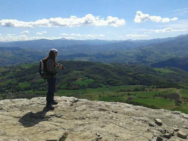 Tutto è iniziato con un saluto al parcheggio della Pietra di Bismantova. Un saluto strano, un saluto tra persone che tramite Facebook sono quasi in confidenza ma che si incontrano per la prima volta. Poco dopo siamo davanti all’Eremo, un edificio dalle proporzioni variabili secondo la luce e il punto di vista sulle strapiombanti pareti de “la Pedra”, come Normanna chiama la Pietra di Bismantova. Dentro l’eremo ci accoglie una delle “Madonne del Latte”, le raffigurazioni di Maria intenta ad allattare Gesù Bambino. Ci congediamo rispettosamente per salire su quello strano ed affascinante altipiano che chiude in alto questo lembo di terra rialzata che ha resistito fino ad oggi al completo sgretolamento. I nostri piedi si spingono fino al bordo di quella tavola mentre Normanna ci parla di Pietro da Talada, “Pietro dei Colori”. A lui piacevano di più l’oro e il rosso ma di fronte a noi c’è un’altra tavolozza di colori, una tavolozza in cui mille sfumature di verde e altrettante diverse tessiture del paesaggio riescono ad inebriarci.