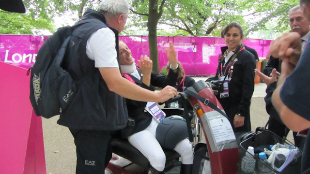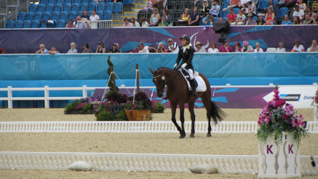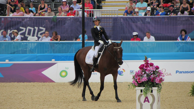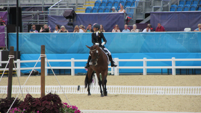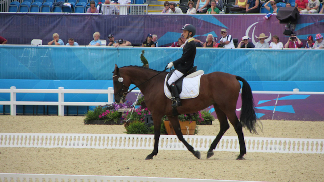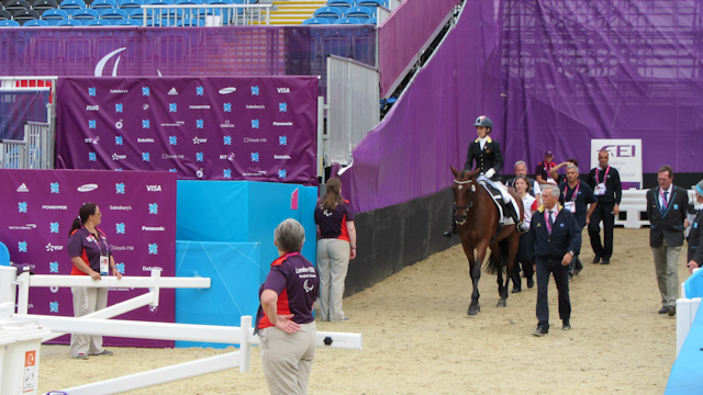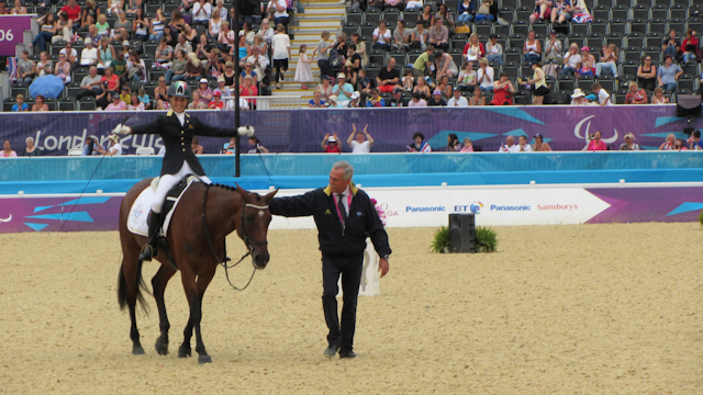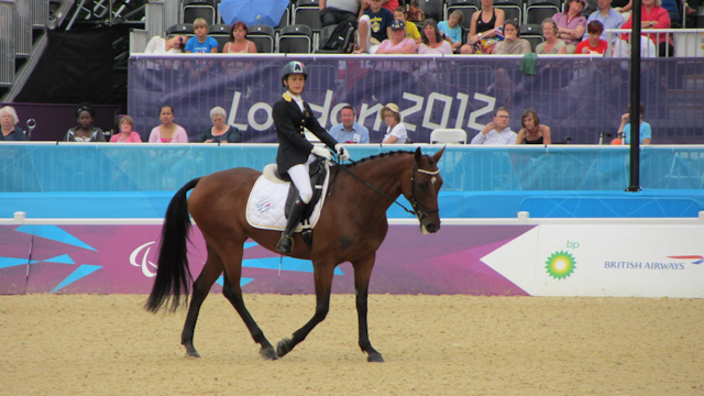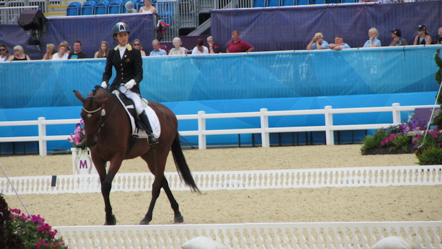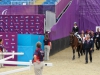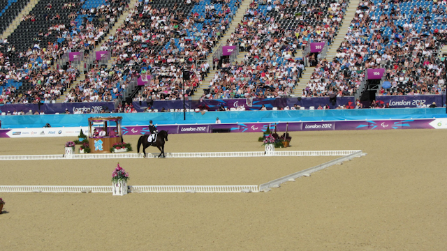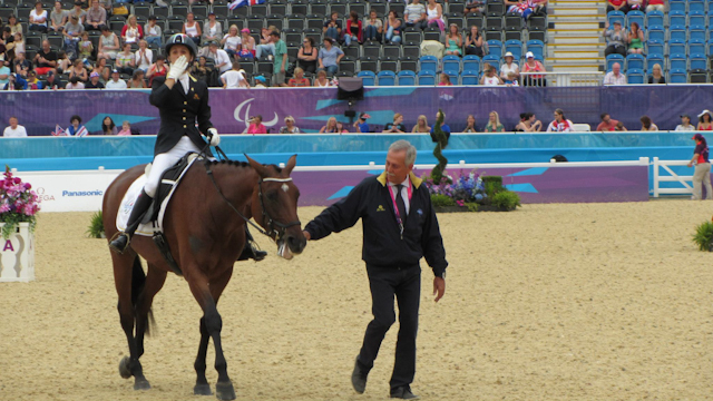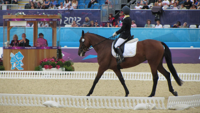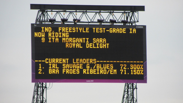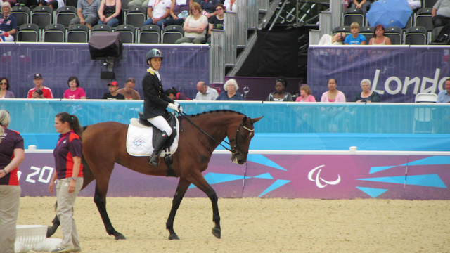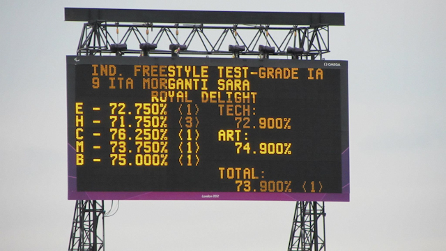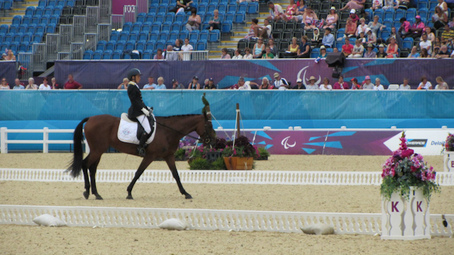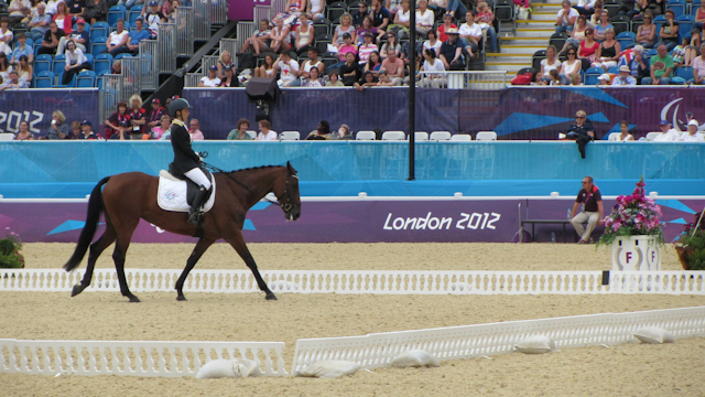 Il sogno è fallito veramente di un soffio. Dopo due decorosissime prove nei test a squadre ed individuali di dressage alle paralimpiadi di Londra(sesto ed ottavo posto), la nostra Sara Morganti ha fallito solo di una posizione, il podio, la medaglia di bronzo nella prova individuale di freestyle, grado 1a disputatasi questo pomeriggio. Sara è giunta quarta con il punteggio di 73.900 e fino all’ultimo c’era stata la speranza di un risultato utile rimanendo prima in seconda e poi in terza posizione nella classifica provvisoria per diverso tempo. La gara è sempre stata saldamente guidata dalla britannica Sophie Christianses che ha ottenuto un bel 84.750, ma fino alle ultime battute il punteggio di Sara era stato il migliore. La classifica è stata rivoluzionata dalle prove della cavallerizza di Singapore Laurentia Tan e dalla irlandese Helen Kearney che, quando ormai la quel podio sembrava possibile, hanno ottenuto rispettivamente il secondo e terzo posto con 79.000 e 78.450. Niente da fare quindi per Sara che comunque oggi pomeriggio è stata veramente grande e ce l’ha messa tutta, dimostrando tutto il suo valore.