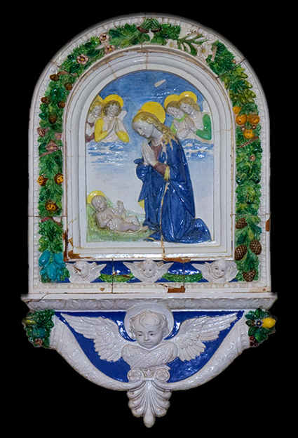 L’opera è contornata da una ghirlanda di foglie, fiori e frutta, che si completa, tra la mensola su cui poggia la piccola pala e l’immagine un poco più alta dell’Adorazione, con tre testine di angioletti. (Manifattura Cantagalli).
