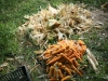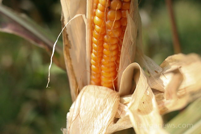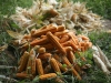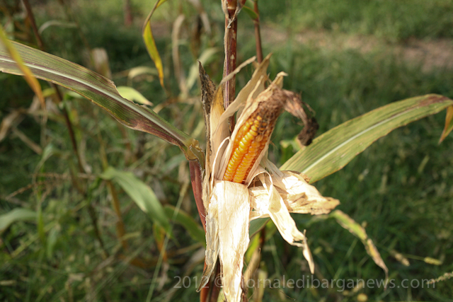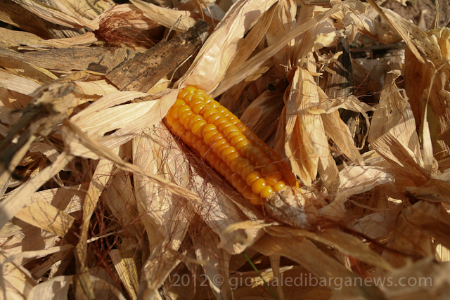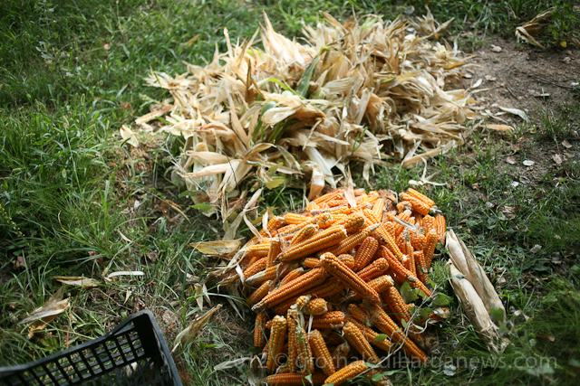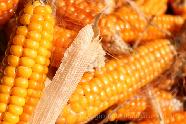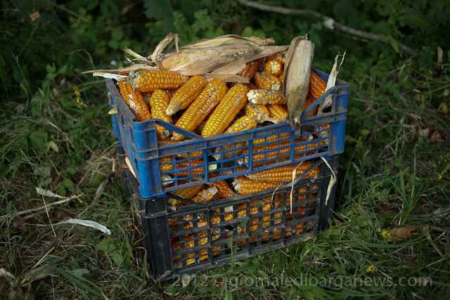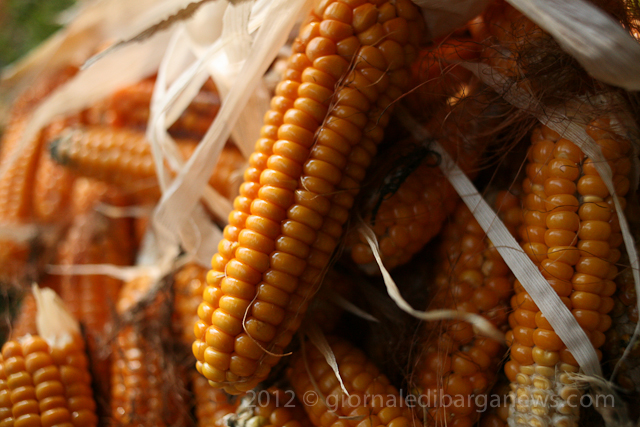 Finally a semi-decent crop from the giornaledibarganews vegetable garden. This afternoon there was a time enough and the weather was kind enough to pick this year’s crop of Formenton otto file – the 8-row maize (Zea Mays) of Garfagnana, locally also known as “Formentone” which was once widely cultivated throughout the valley, exclusively for use as food. Later it almost completely disappeared as a result of the depopulation of the mountain areas and the abandoning of crop farming. In recent times, the rediscovery and renewed popularity of typical and ancient products has convinced certain farmers of the region, who had continued to grow it, to devote special care to its cultivation, avoiding “contamination” with other varieties offering greater yield but inferior quality. It is a herbaceous plant, growing to a height of about two metres, bearing one or two ears per stem. The ears are long and covered by many coats of leaves. The mature kernels are an orangey yellow colour, with slight, more or less intense shading, round and fairly large. This crop does not have a high yield, but boasts nutritional features which now distinguish it as an excellent maize for polenta. – source – AurelioBaretini