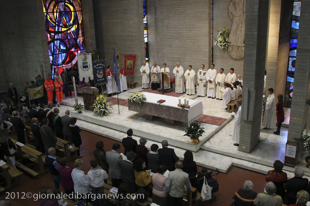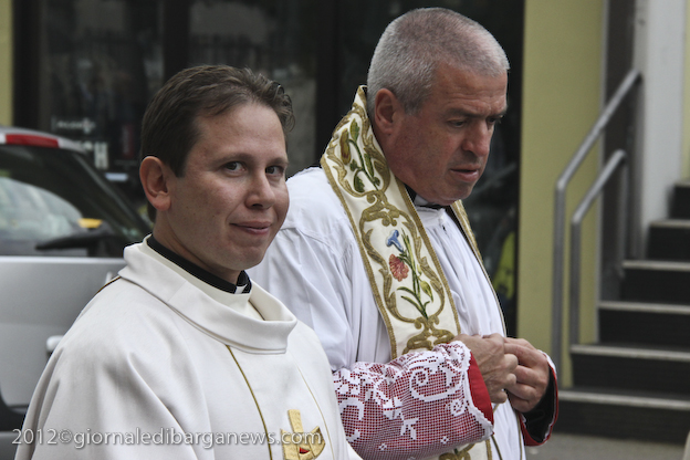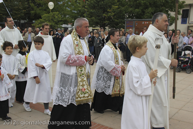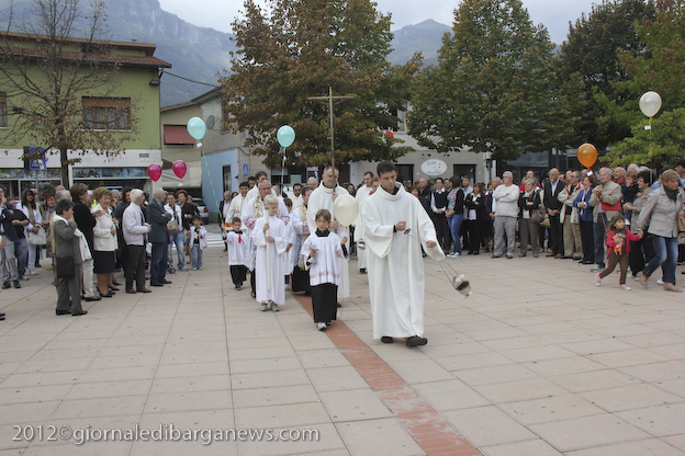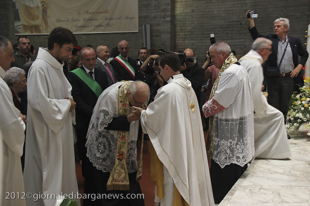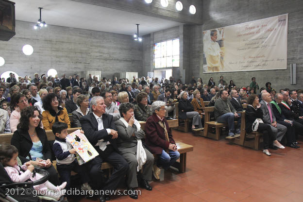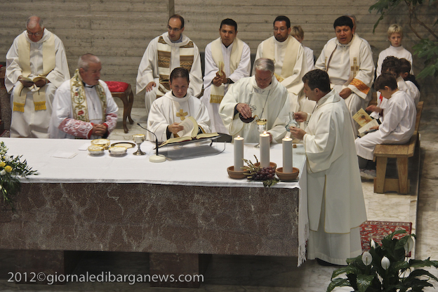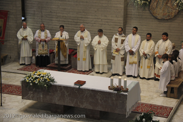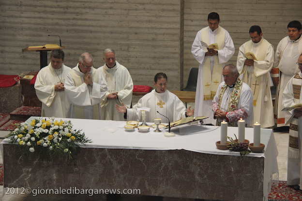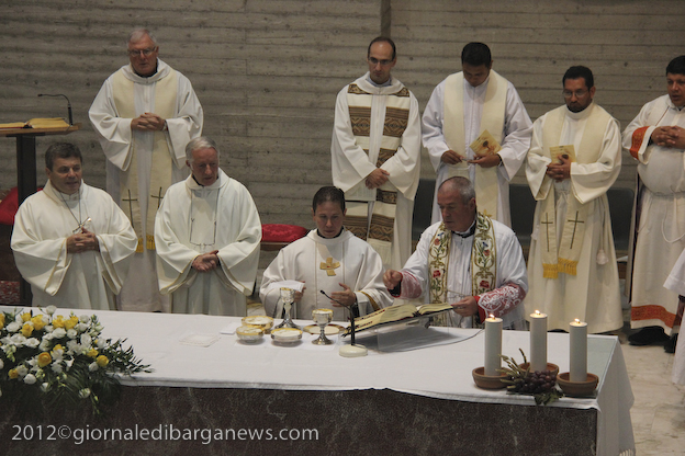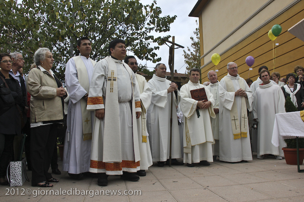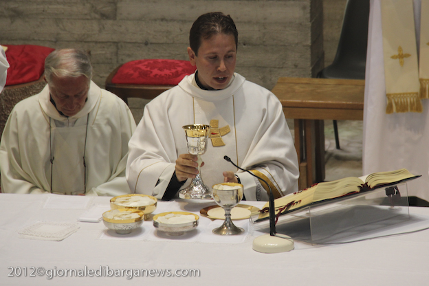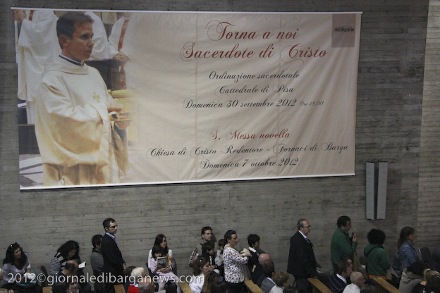 Si è dunque formata la processione a piedi che, attraverso Via della Repubblica e Via Mozza, ha condotto don Lorenzo alla chiesa di Cristo Redentore, dove intanto i campanari di Barga facevano la tradizionale “toccheggiata” in onore del nuovo presbitero. La chiesa, letteralmente gremita, ha visto l’emozionante celebrazione della S. Messa da parte di un impeccabile don Lorenzo, affiancato per l’occasione non solo da don Antonio, ma anche da Mons. Roberto Filippini, rettore del Seminario di Pisa, don Luca Facchini, viceparroco di Calci ove il nostro ha prestato servizio nell’ultimo anno, P. Paolo Biagi che nella scorsa settimana ha tenuto il ciclo predicatorio in preparazione alla messa novella, gli amici Padri Walter, Alberto e José sacerdoti messicani che prestano servizio a Fornaci in occasione delle festività, i diaconi Luigi Moscardini e Marco Tomei e alcuni degli (ormai) ex compagni di seminario di Lorenzo, tra cui il molognese Alessio Lenzarini che il prossimo 25 novembre diventerà diacono, avviandosi sullo stesso percorso del festeggiato.