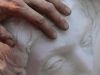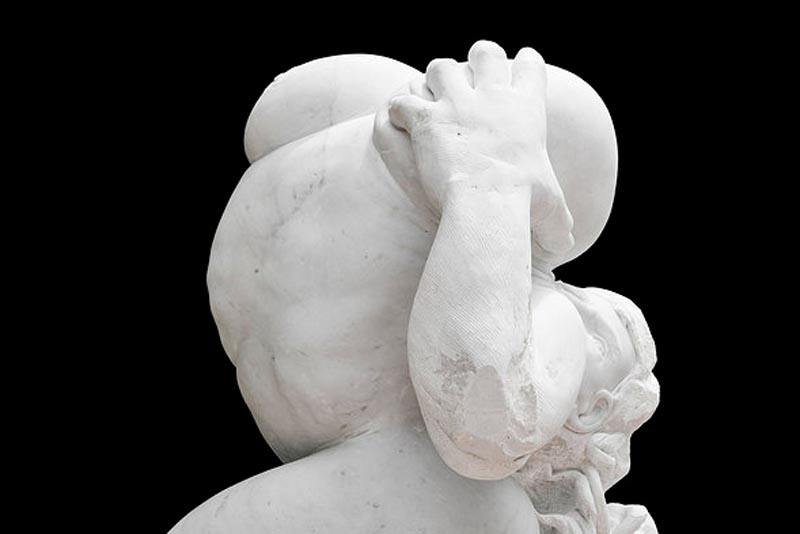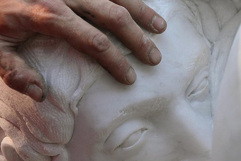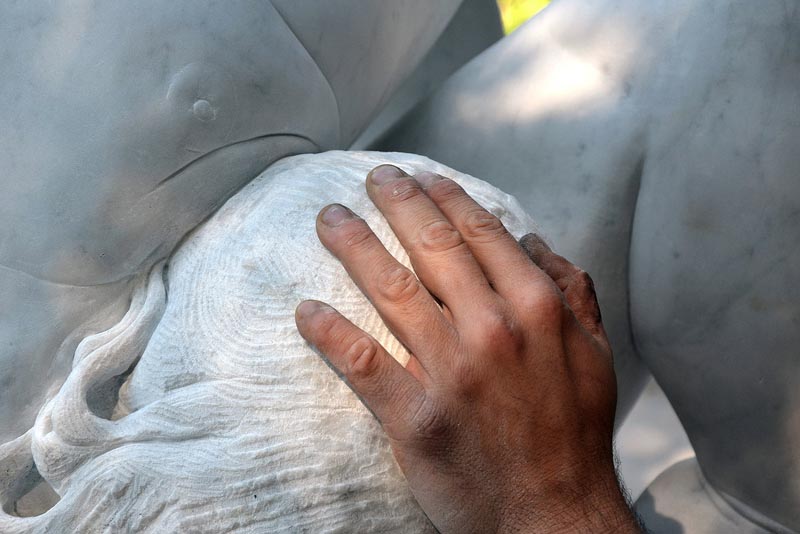 Lorenzo Vignoli, who was born and raised in the Apuan Alps, began as a painter and moved into sculpting after completing his artistic training between Paris and Tuscany. The collaboration with the psychoanalyst Alejandro Trapani motivated him to use sculpture as a way of shedding light on a hidden intro-psychic world. The instinctive choice of marble, a traditional material par excellence, contributed greatly in narrowing the focus of his work. For Vignoli the search for a dialogue and relationship with the material is first and foremost. His is a gradual approach which proceeds by trial and error, by contemplating the misstep, the error, the wrong turn, the restart; as in building a bond that does not have a fore-written ending. There is a modus operandis which is the mere technical translation from the idea to the drawing, and which therefore considers the peculiar nature of each block of marble as an “accident”; a closed deterministic approach, albeit of great technical ability, but which is not Vignoli’s. He prefers to wait for the embedded form within the matter to manifest itself naturally, guided by the direct participation of the artist in an emotional event.A sculptor is not a spectator, and the gradual emergence of the work is akin to performance art in which “recognition” and expression are two competing forces. Vignoli’s is the synthesis of the school of Canova, which sees sculpture as a three- dimensional extension of the reduced plastic potential of drawing, and that of Michelangelo, which approaches material with a more open mind, with more questions than answers, trying to find images within the marble which mirror our ability to find something in reality that reflects us.