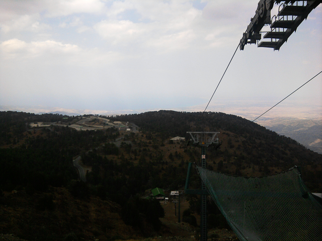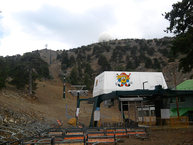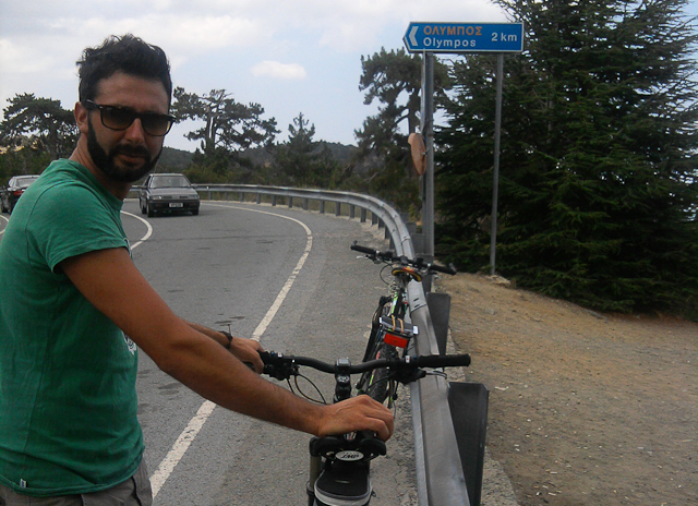 Alla mattina ci svegliamo abbastanza tardi e fuori fa ancora fresco, meraviglioso. Girottoliamo per il paese, che non è un vero e proprio paese. E’ immerso in un bosco di pini odorosi con una moltitudine di sentieri per trekking e mountain bike. Ai chioschi dei souvenir è un continuo via vai di russi che arrivano coi loro suv. I nuovi conquistatori dell’isola. Arriviamo in prossimità del monte Olimpo, non possiamo raggiungere la vetta perché c’è un mega-radar dell’esercito inglese fatto a forma di pallina da golf, con l’unica differenza che è gigantesca. A fianco arriva la seggiovia che d’inverno porta su gli sciatori. Sembra un altro mondo. Si vede il mare della parte turca oltre la green-line. In lontananza un ammasso urbano biancastro, Nicosia. Fra l’orizzonte e le montagne una distesa gialla infuocata, il nostro deserto del Kalahari. Fanculo! Sembra così piccolo da qui, e magari lo è, però in bici è tutto così infinito certe volte. Comincia a piovere e fa piuttosto fresco. Tutt’intorno le montagne sono ricoperte da pini sin sulle vette. Qua e là altre palline da golf gigantesche sulle vette più alte.