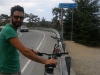Pale eoliche in lontananza e il mare di Pafos sempre più vicino. Poi succede quello che ci eravamo dimenticati, foriamo. Facciamo una piccola sosta lungo la strada per un bisogno e quando torniamo a prendere le bici troviamo la mia ruota posteriore a terra. Non c’è problema si cambia. In tempo record facciamo il cambio camera d’aria. Siamo troppo forti ora. Il tempo di rimettere dentro gli attrezzi e la ruota va giù di nuovo. Sole, 43 gradi e l’incazzatura che sale. Ri-togliamo la camera d’aria riparata dal tipo a Dipkarpaz. La toppa è da una parte e il buco dall’altra. Maledetto, non ci fermerai. Montiamo, dopo un rito scaramantico, l’ultima camera d’aria buona che abbiamo. Mancano 30km all’arrivo, ma non si sa mai. Finalmente si riparte. Lungo la discesa, facciamo rifornimento d’acqua in un piccolo mercato e ci mettiamo a mangiare dei biscotti sotto una pergola. Un nonnino si mette accanto a noi e ci saluta kalimera (buongiorno), kalimera anche a lei. Sta lì, non dice altro. Guarda le bici, guarda le macchine che passano in strada, guarda gli altri avventori coi quali non socializza. Di noi capisce solo che veniamo dall’Italia, di lui noi non capiamo nulla. Sta lì all’ombra della pergola. Ci alziamo per ripartire. Si alza anche lui, che gentile saluta e torna verso casa. Siamo stati la sua compagnia per venti minuti circa.